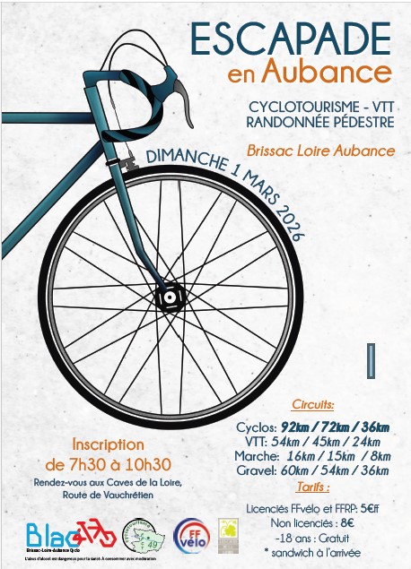 Le dimanche 1er Mars 2026, le BLA Cyclo organise sa traditionnelle randonnée « Escapade en Aubance » qui emmènera les participants à travers nos sentiers et routes de notre belle région.