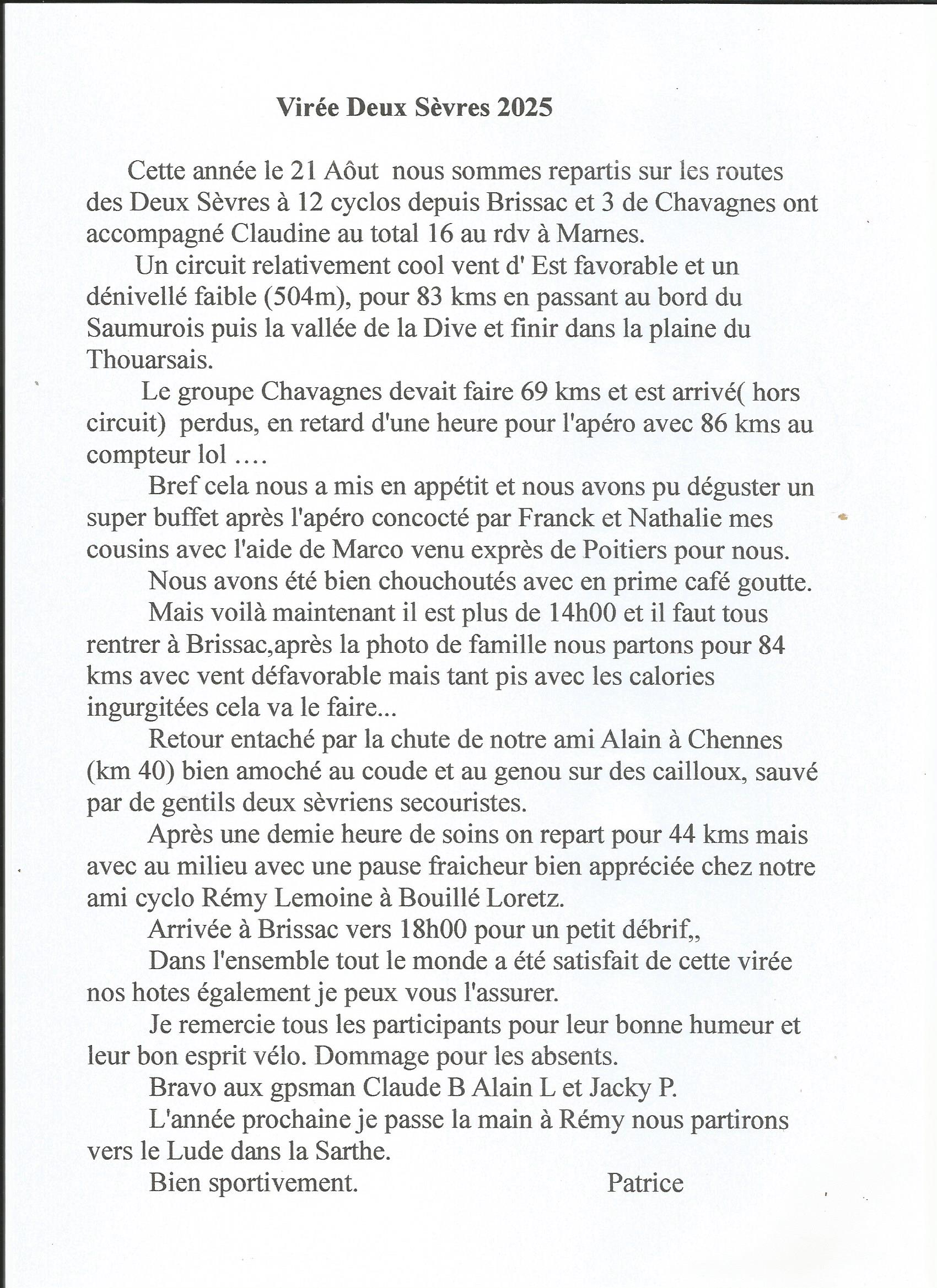 Catégories Vie du club Une petite virée dans les Deux Sèvres Auteur de l’article Par LELARGE-MICHEL Date de l’article 3 septembre 2025 Aucun commentaire sur Une petite virée dans les Deux Sèvres Compte rendu Virée Ds 2025Télécharger ← Un petit tour en Mayenne → Rentrée Ecole Jeunes Vététiste saison 2025/2026 Laisser un commentaireVous devez vous connecter pour publier un commentaire.